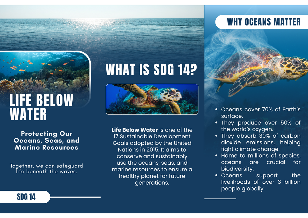 This infographic focuses on Sustainable Development Goal 14: Life Below Water, aiming to raise awareness about the urgent need to protect our oceans, seas, and marine life. Through clear visuals and impactful data, it educates viewers on threats like pollution, overfishing, and climate change. The goal is to inspire action, encourage sustainable practices, and foster a deeper understanding of how ocean health is vital to global ecosystems and human well-being.